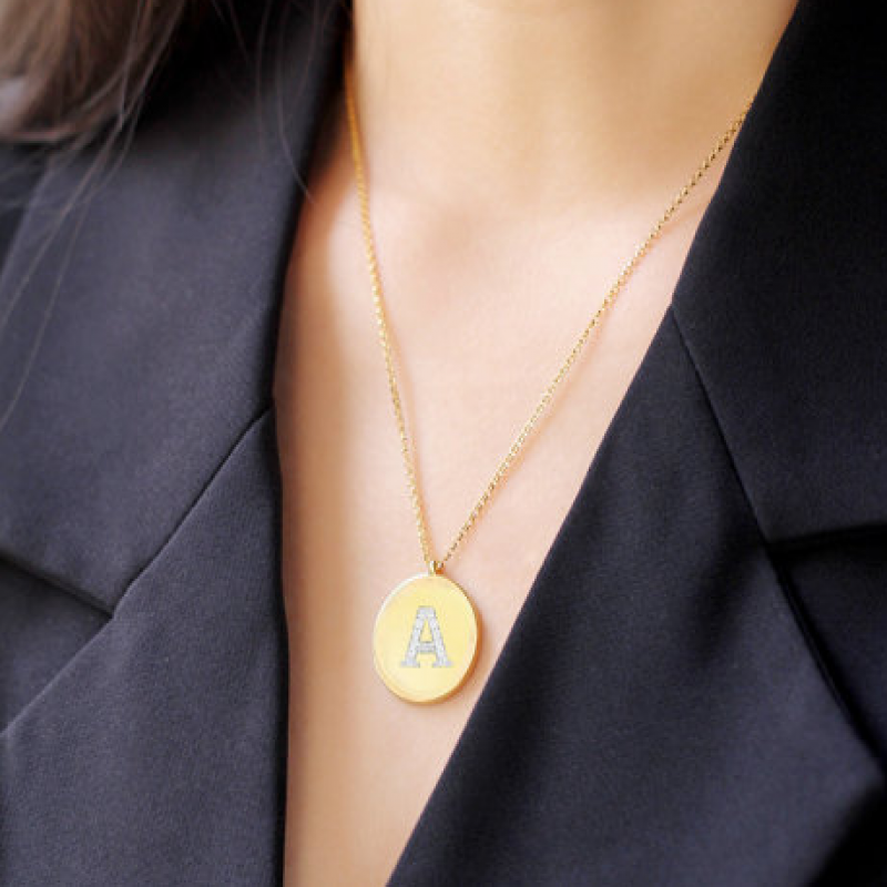 【林志玲 姚晨 蔡依林同款】APM Monaco金黄色英文名字首字母项链女 圆牌毛衣锁骨颈链 AC3880OXY 简约S925银挂件情侣闺蜜送女友礼物中性男款潮首饰品