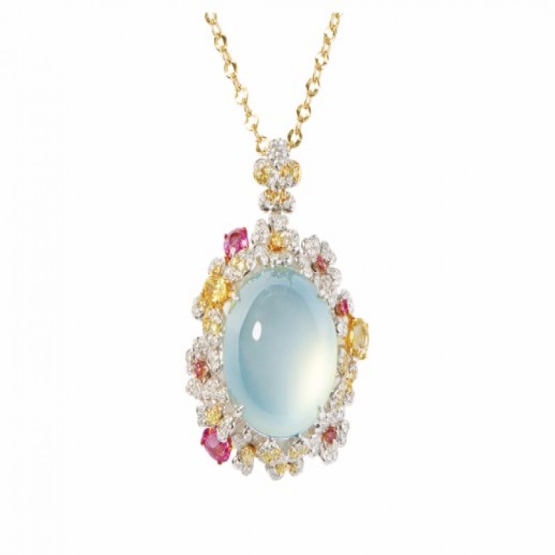 七彩云南baoyuhe/宝裕和珠宝 设计师高定玻璃种翡翠 18K金 镶嵌黄钻 白钻 粉色红蓝宝石 项链吊坠 荣获《芭莎珠宝》年度杰出珠宝设计大奖