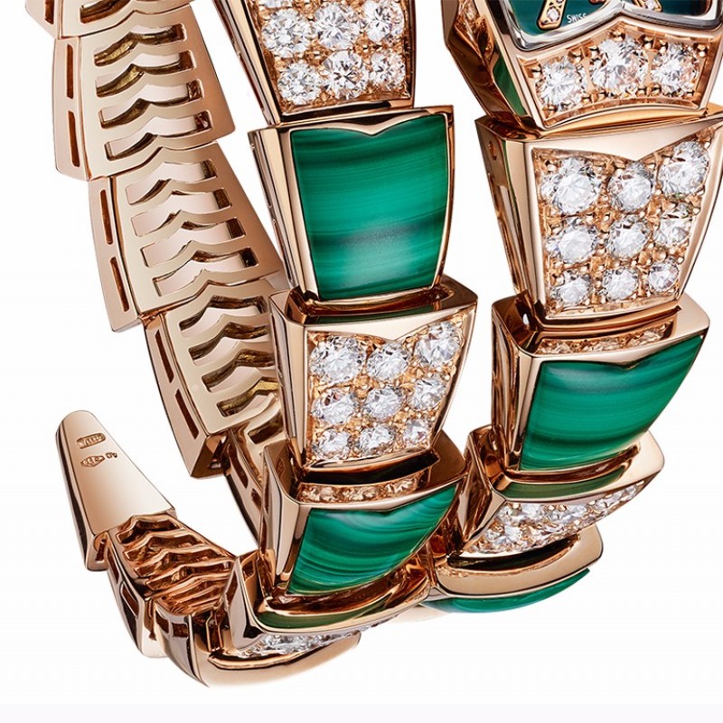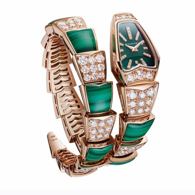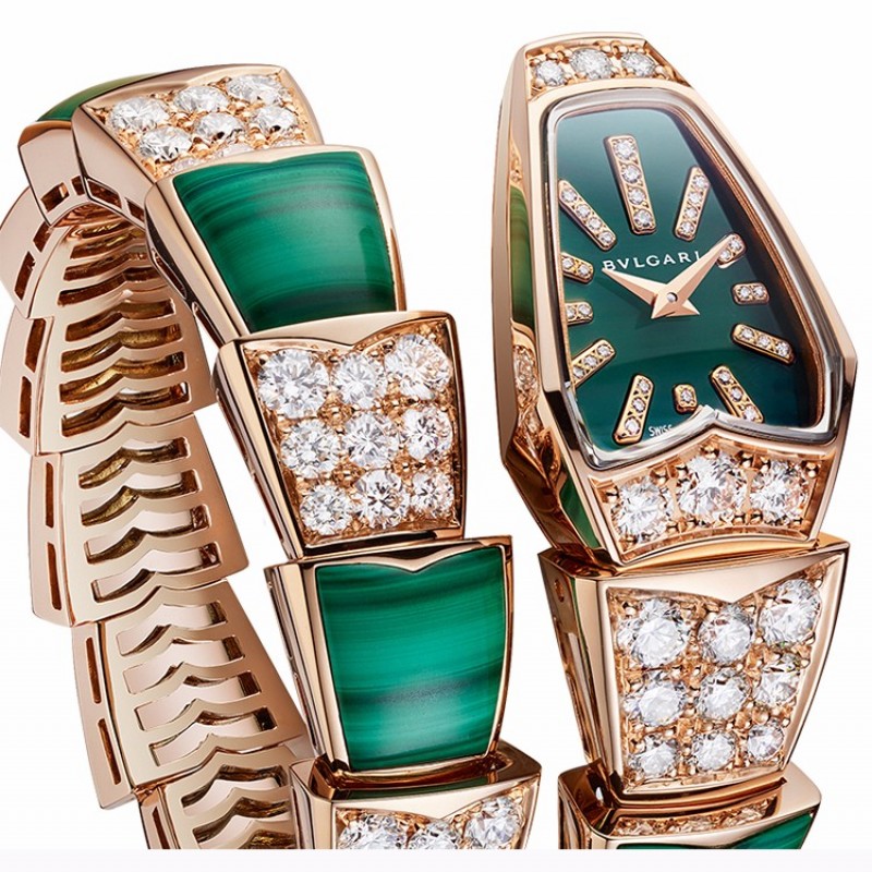BVLGARI/宝格丽 Serpenti系列 女士蛇形玫瑰金明亮式切割钻石镶饰表壳孔雀石镶饰表带手表女表 102678